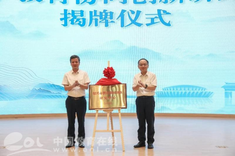 会上成立了绍兴市教育协同创新研究中心,赵阳和石剑晗共同为中心揭牌。