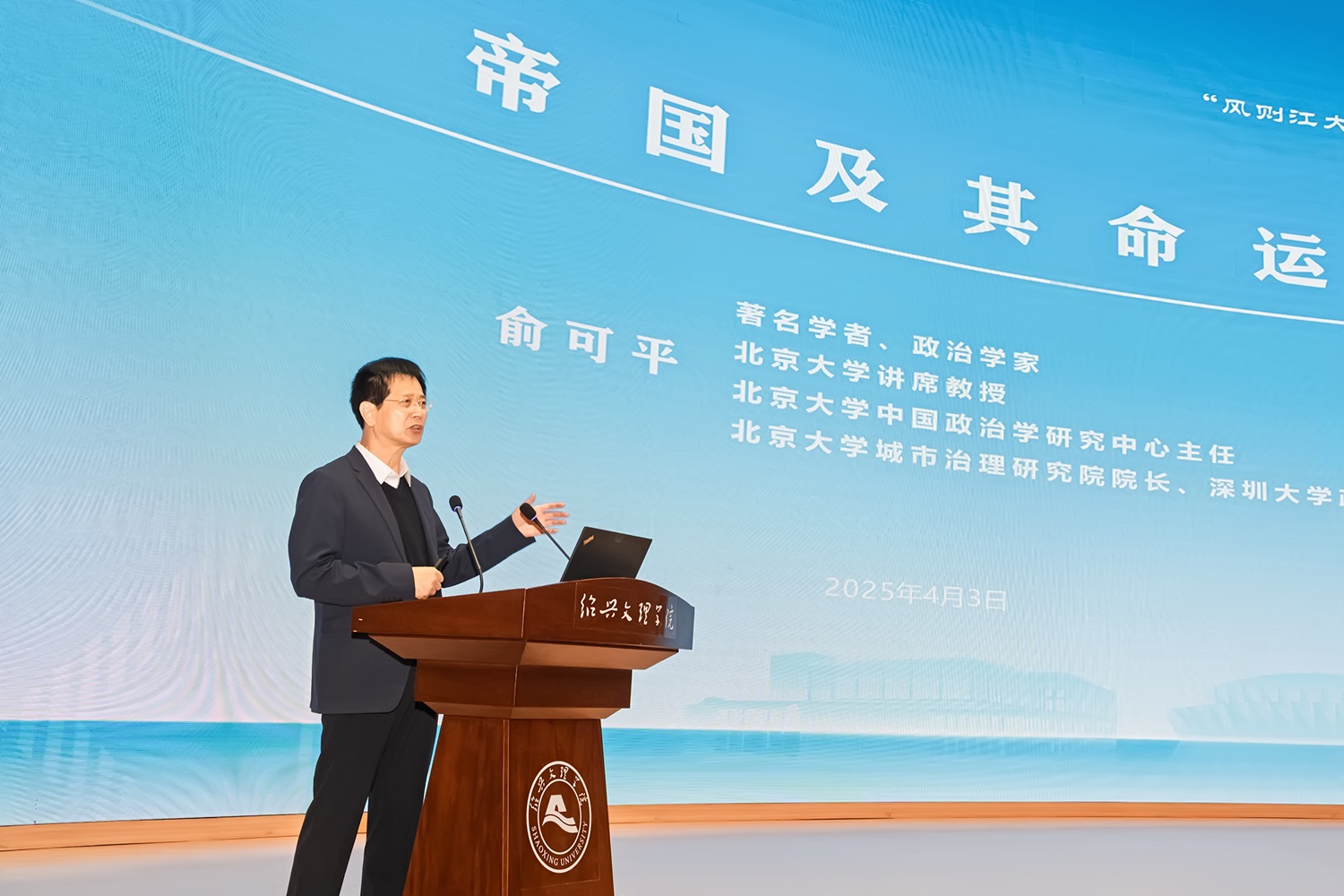 颁奖典礼后,俞可平应邀作客“风则江大讲堂”,为师生作主题为《帝国及其命运》的讲座,系统阐述帝国的本质、兴衰逻辑及对当代国际秩序的启示。讲座由崔凤军主持。