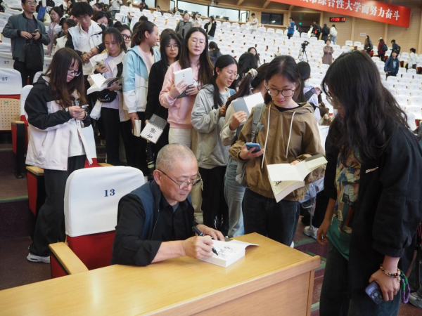 讲座结束后,同学们就小说内容、文学创作等问题与刘醒龙展开积极互动,最后签名环节场内排期长队,文化氛围空前高涨。