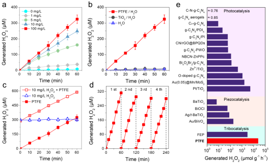 催化剂浓度从1 mg/L增加到100 mg/L, H2O2浓度从37.8 ± 5.2增加到324.8 ± 27.2 μM,整个反应过程符合零级动力学特征;在无催化剂以及以TiO2为催化剂的体系中,H2O2的产量几乎可以忽略不计,证实H2O2是由PTFE催化主导产生;循环实验证实PTFE催化剂非常稳定;与常见的光催化剂和压电催化剂对比后发现,PTFE催化剂显示出最佳的H2O2合成性能。