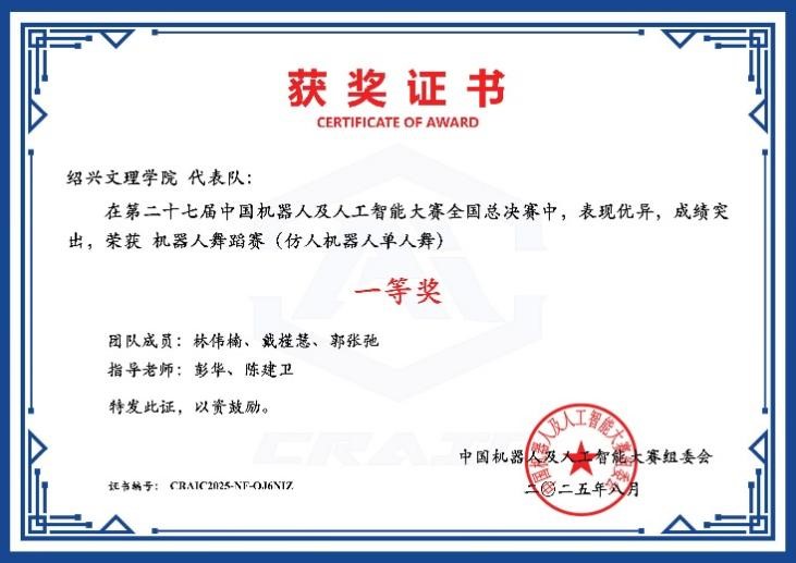 近日,由中国人工智能学会主办的第二十七届中国机器人及人工智能大赛全国总决赛落下帷幕。经过十天的激烈角逐,由我校智能工程学院组织,彭华、李菁、屠昂燕、王涛、陈建卫等老师指导,来自智能工程学院、蔡元培艺术与设计学院、商学院的学生组成的参赛队伍,在仿人机器人单人舞、多人舞两个赛项中取得了优异成绩:共获得全国一等奖4项、二等奖1项、三等奖1项。尤其是仿人机器人单人舞赛项,我校学子再次夺得全国第一名!这是继2022年、2023年后,我校学子第三次捧起冠军奖杯!!